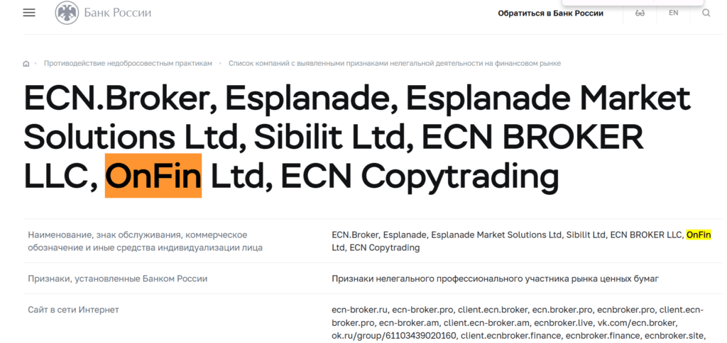 Официальный сайт Центрального банка России содержит шокирующее предупреждение: OnFin работает без лицензии! Это значит, что ваши деньги абсолютно незащищены.